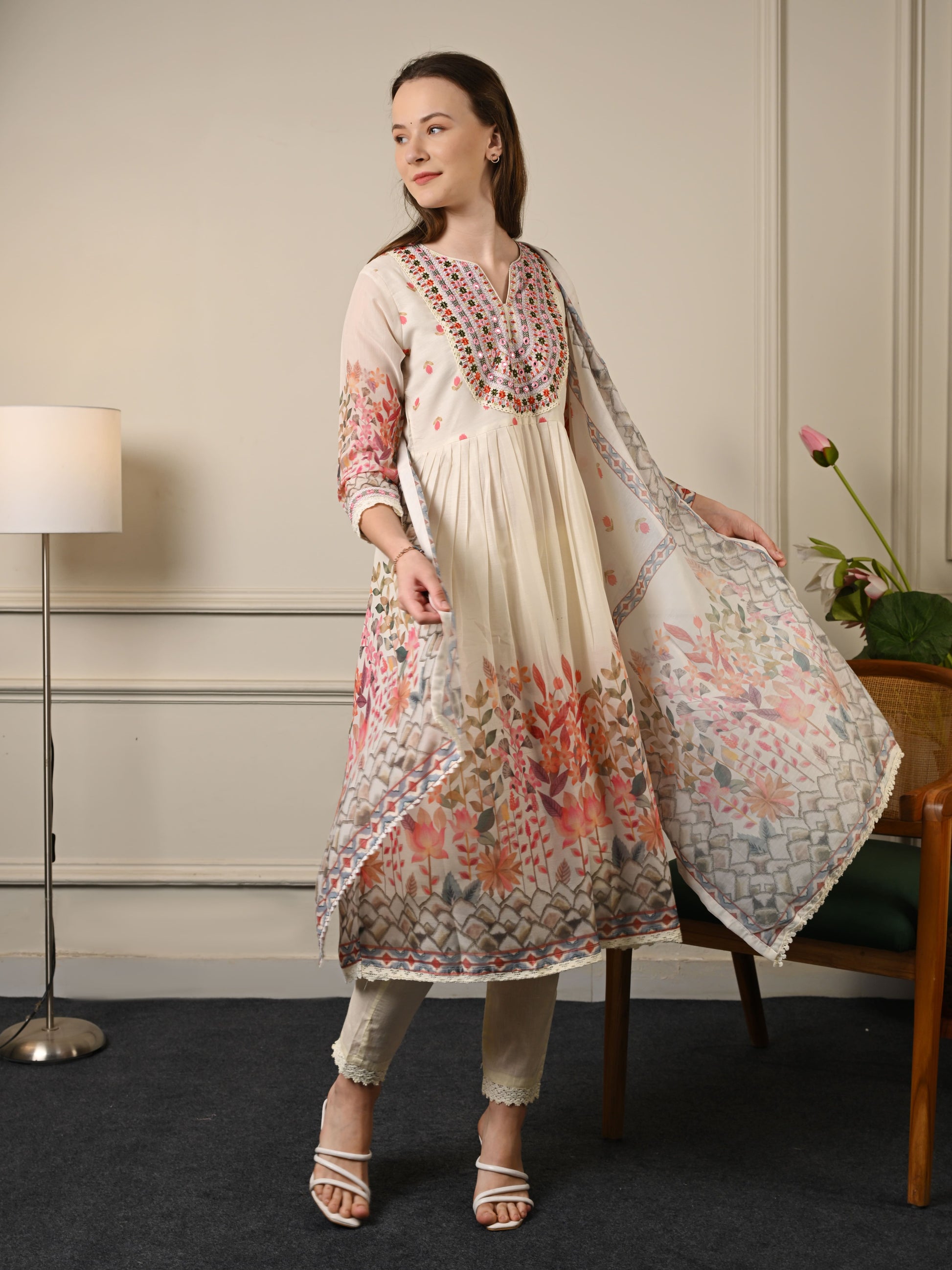 Beige Mul Cotton Anarkali Suit Set