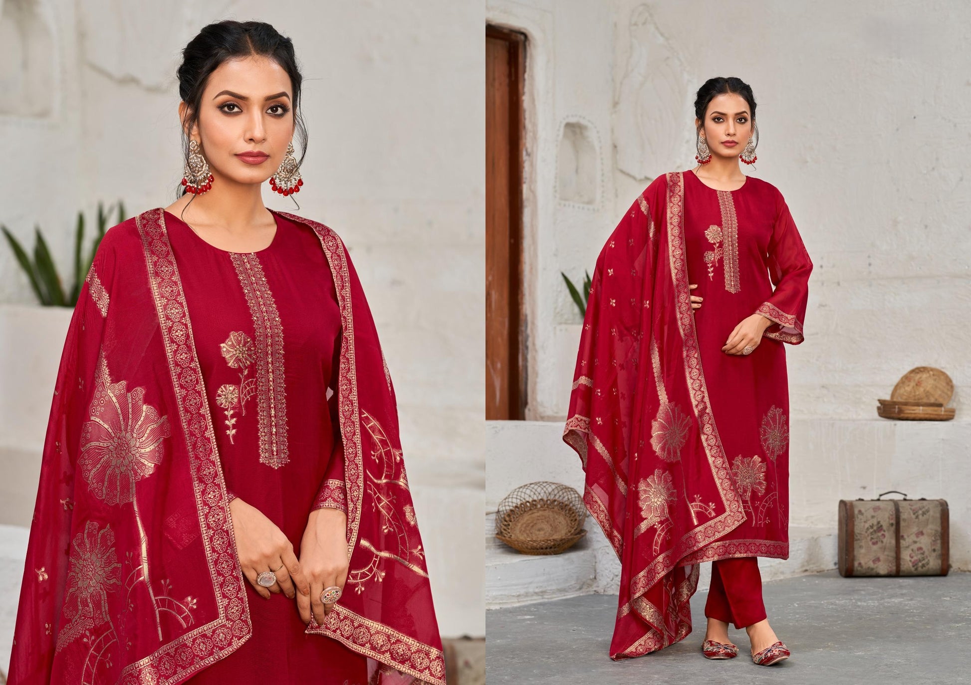 This elegant Ruby Red silk suit set showcases exquisite zari thread work and sequins on luxurious silk fabric, exuding festive charm. Designed with a comfortable soft cotton lining, it offers a smooth fit and enhanced durability.