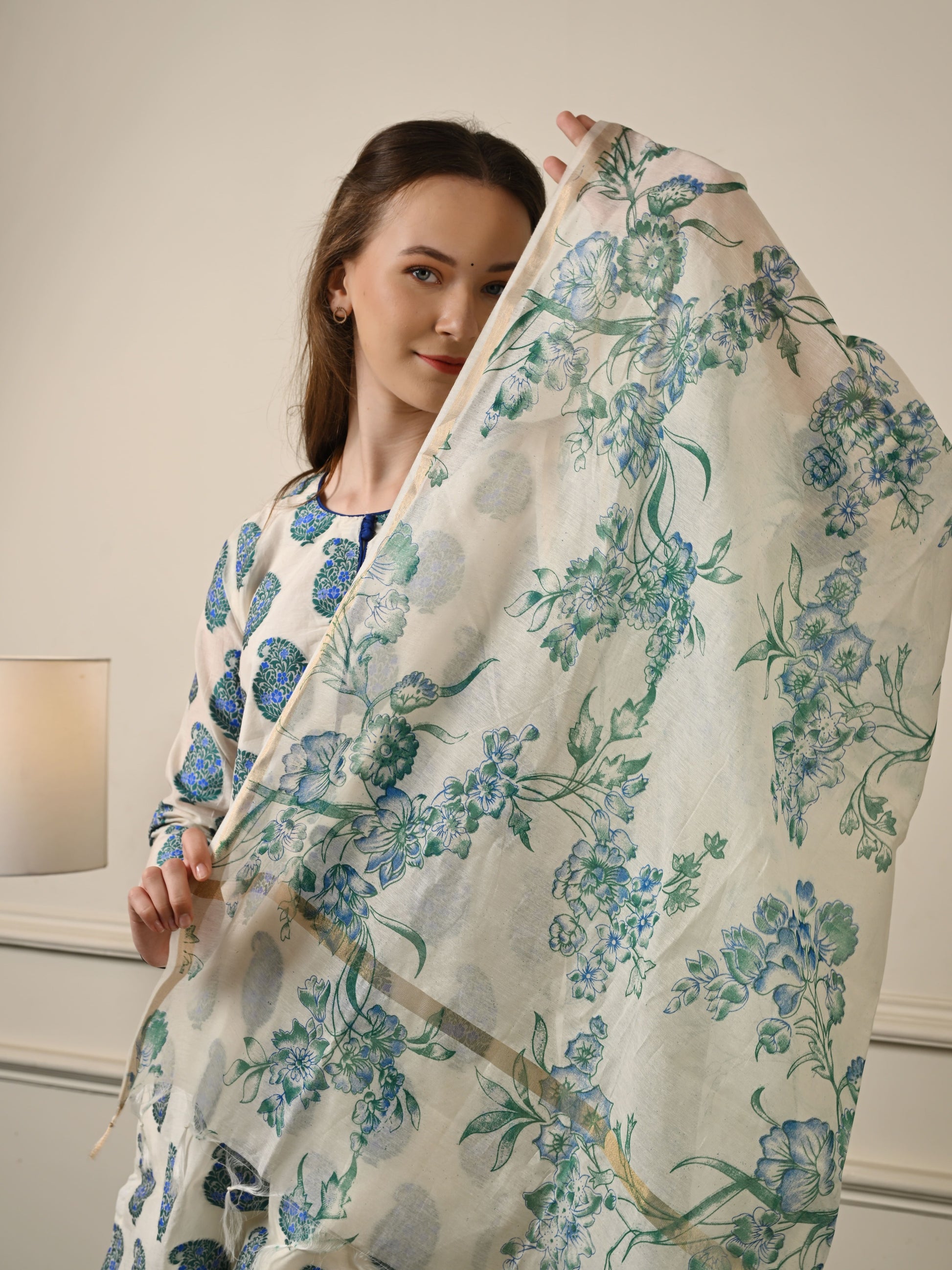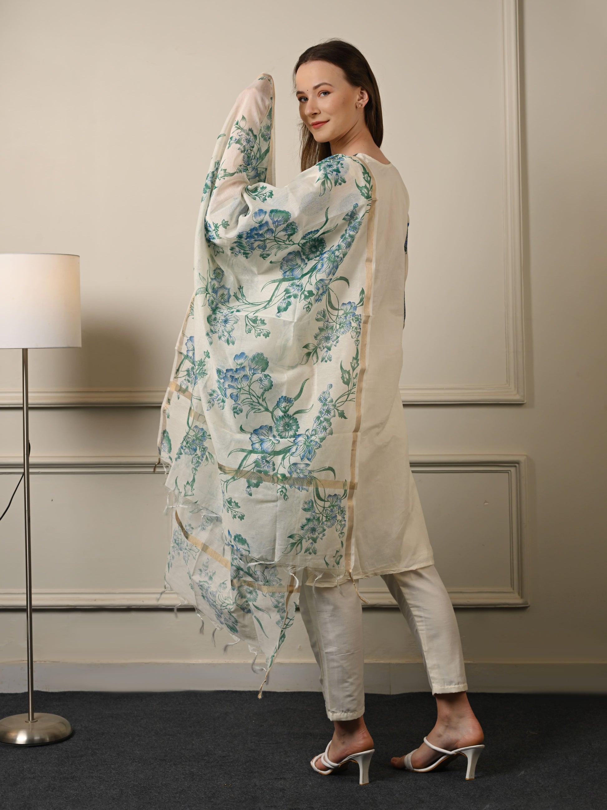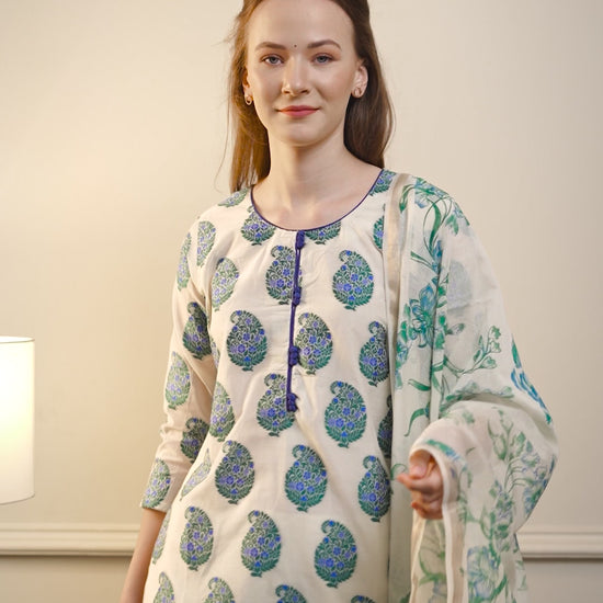 This off white stunning kurta set features blue butas all over with button detailing on neck, adding a touch of elegance to your wardrobe. Crafted from cotton raw silk, it's lightweight and breathable, perfect for any occasion. Elevate your ethnic wardrobe with this elegant and timeless piece.