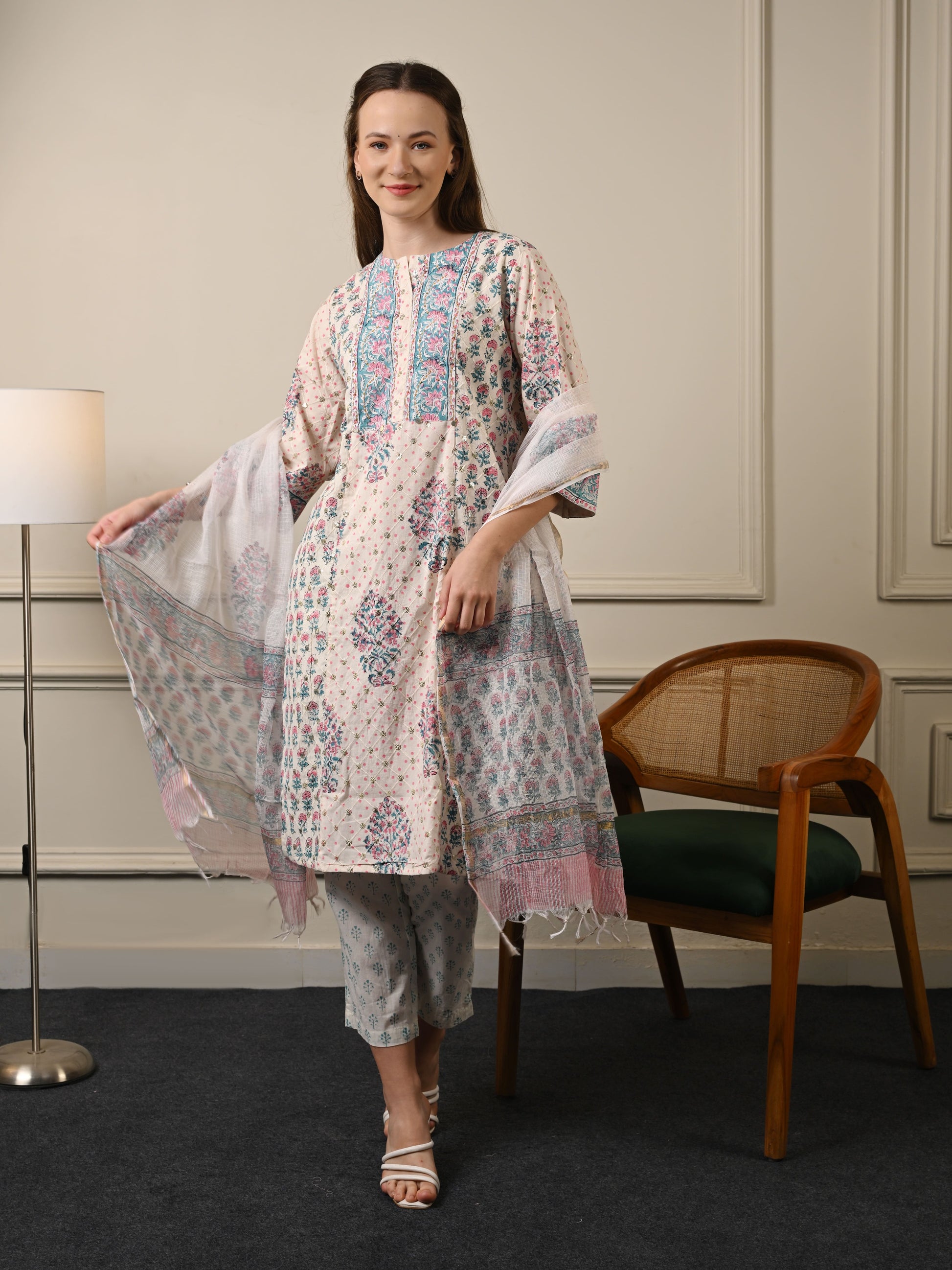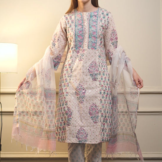 This Pastel suit set features neck sitara/threadwork detailing, adding a touch of elegance to your wardrobe. Made from chanderi cotton, it's lightweight and breathable, perfect for any occasion.